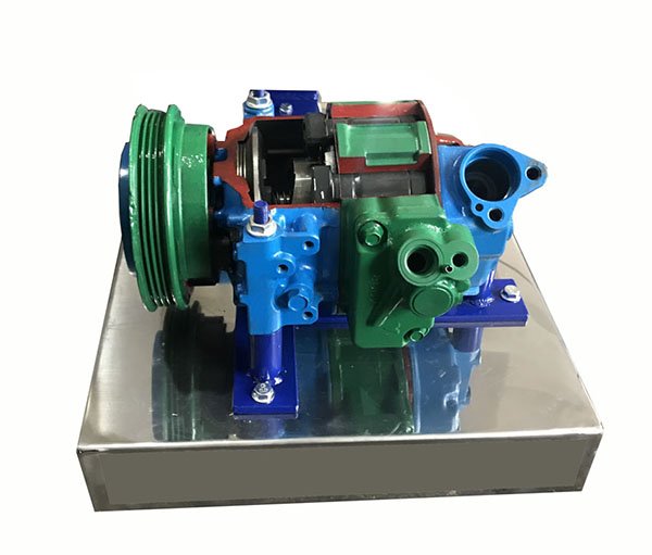 以真實汽車配件解剖 ,本臺架采用了空調(diào)壓縮機(jī)實物進(jìn)行解剖,各零部件齊全,能夠全面的展示空調(diào)壓縮機(jī)內(nèi)部結(jié)構(gòu)。通過巧妙的解剖和各剖面噴涂不同顏色,使空調(diào)壓縮機(jī)內(nèi)部的機(jī)械結(jié)構(gòu)和相互之間的裝配關(guān)系清楚的顯現(xiàn)在外面